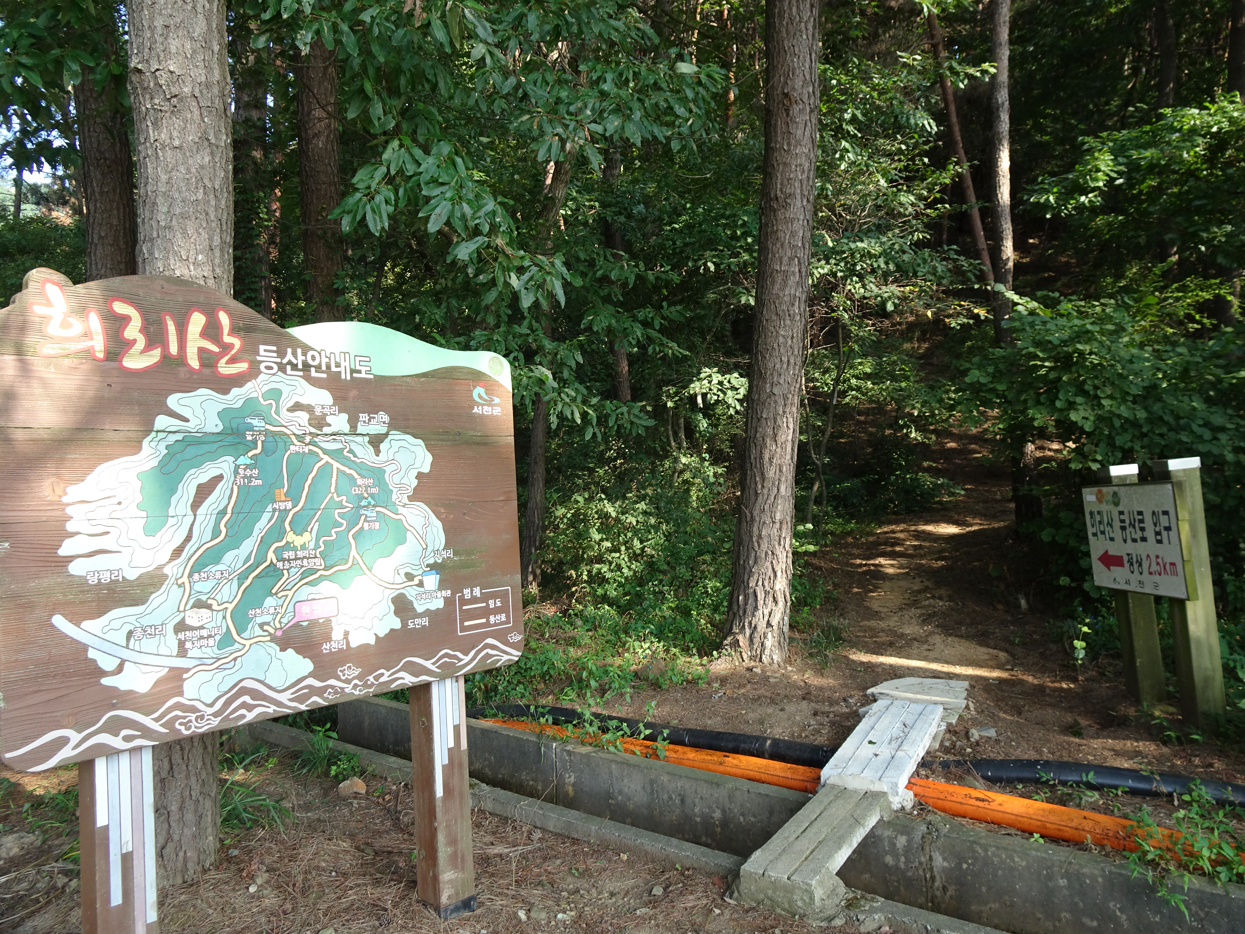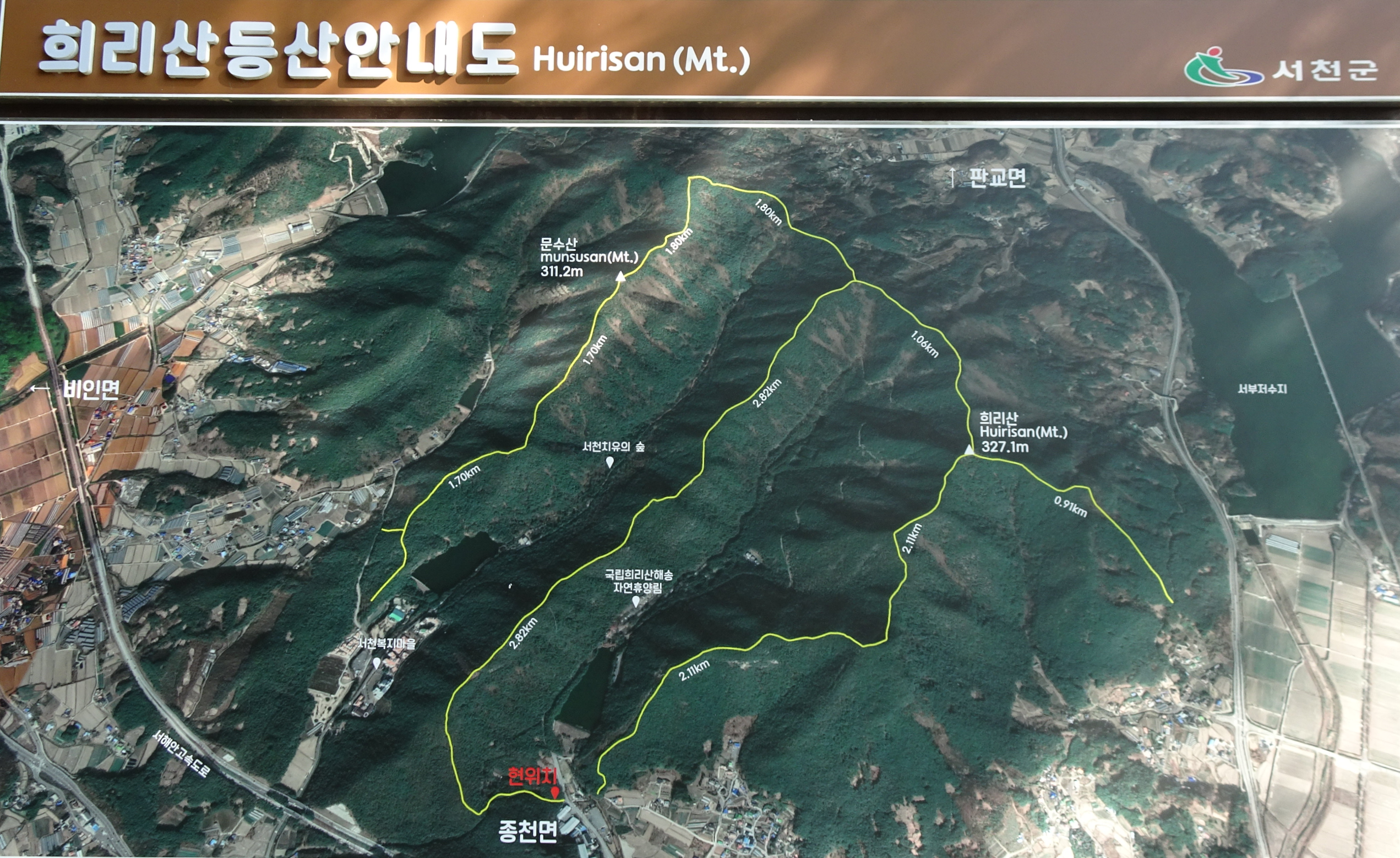 ① 신천저수지 옆 희리산 등산로 소형주차장 - 다리 건너 오른쪽 임도 - 등산로 입구 - 산길 - 6호, 5호 쉼터 - 희리산 정상 - 4호 쉼터