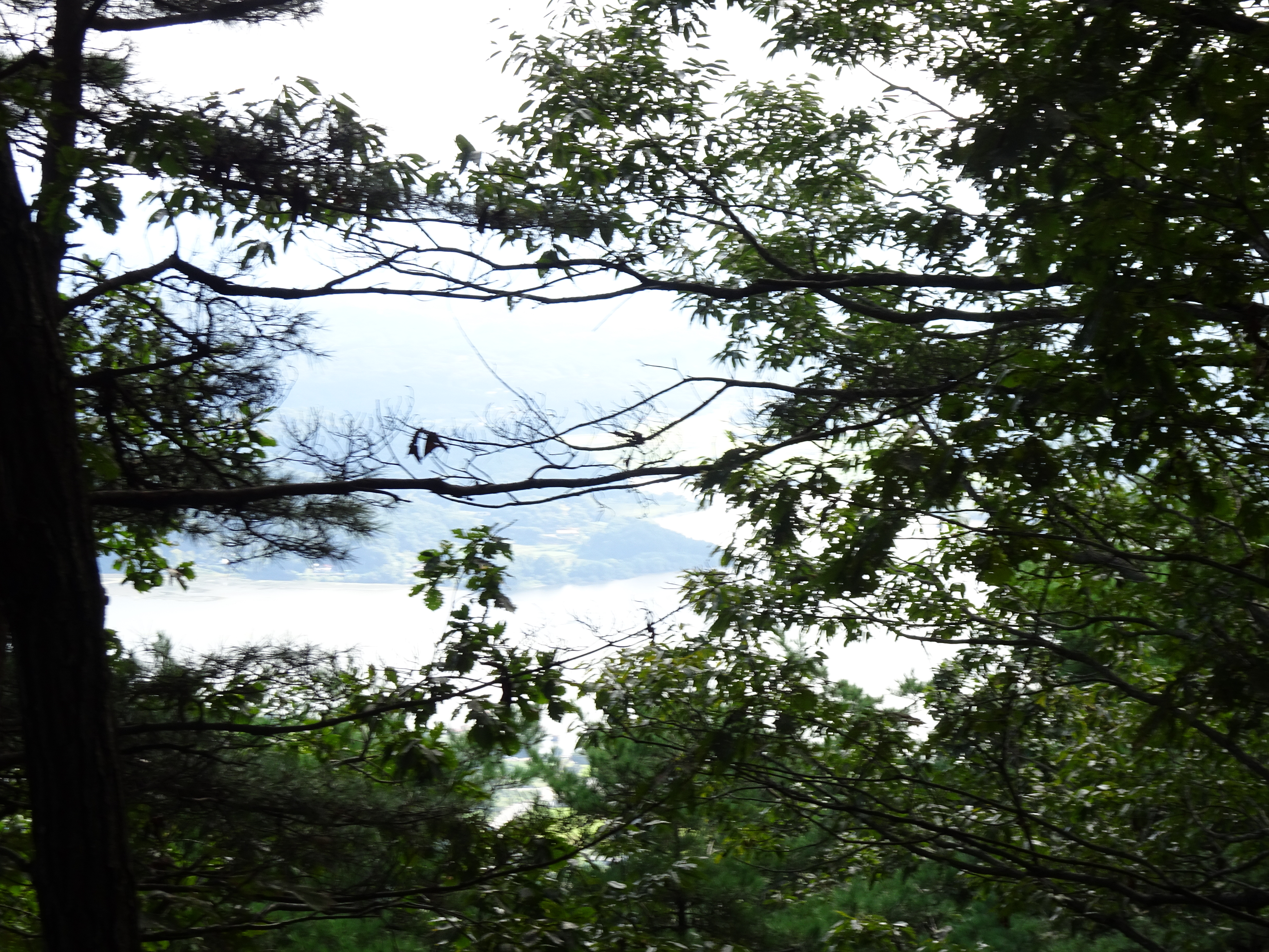 나무들 사이로 멀리 예당호가 보인다.