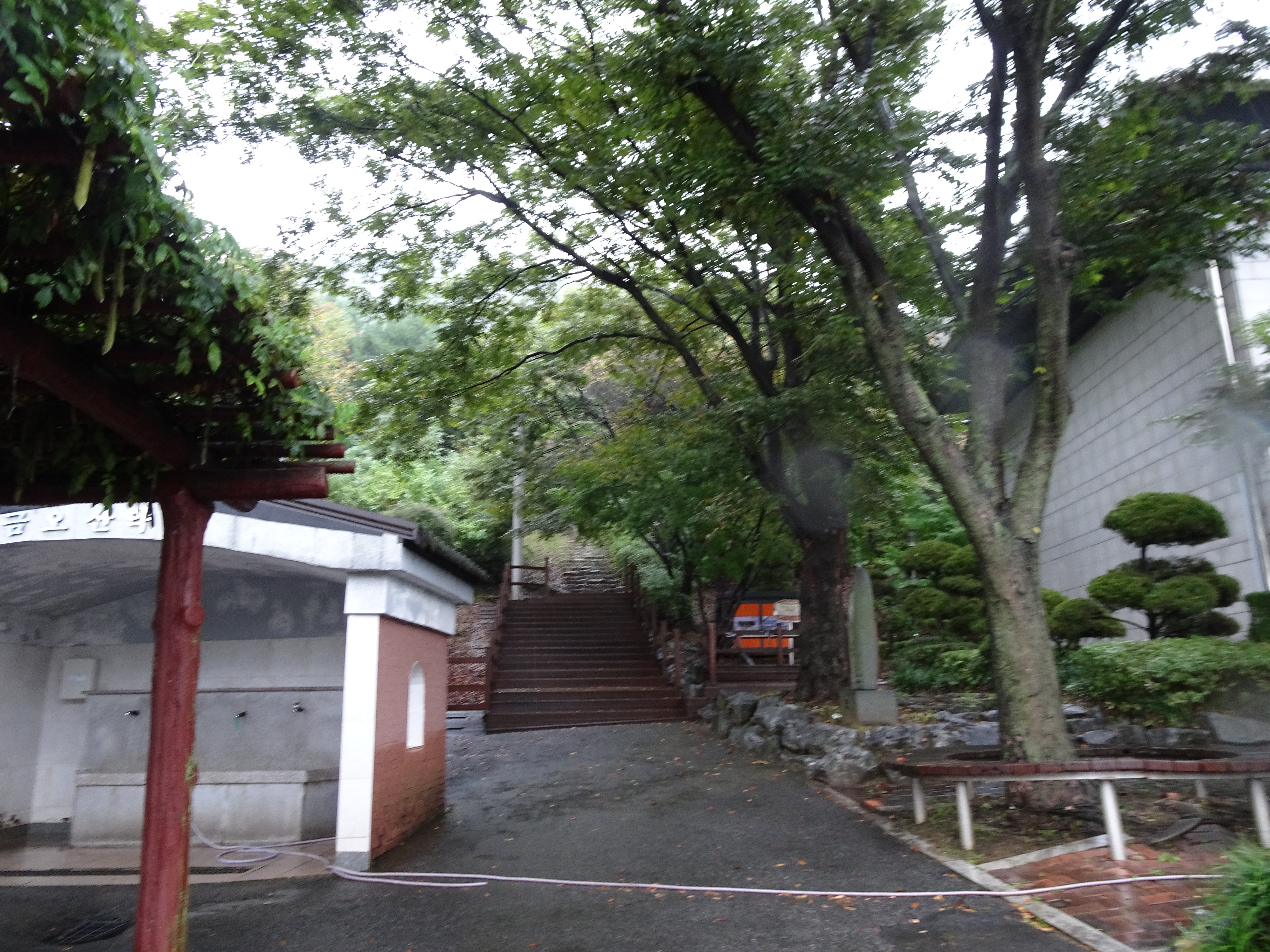 표지석 뒤 약수터가 있고, 그 뒤에 보이는 계단이 들머리다.