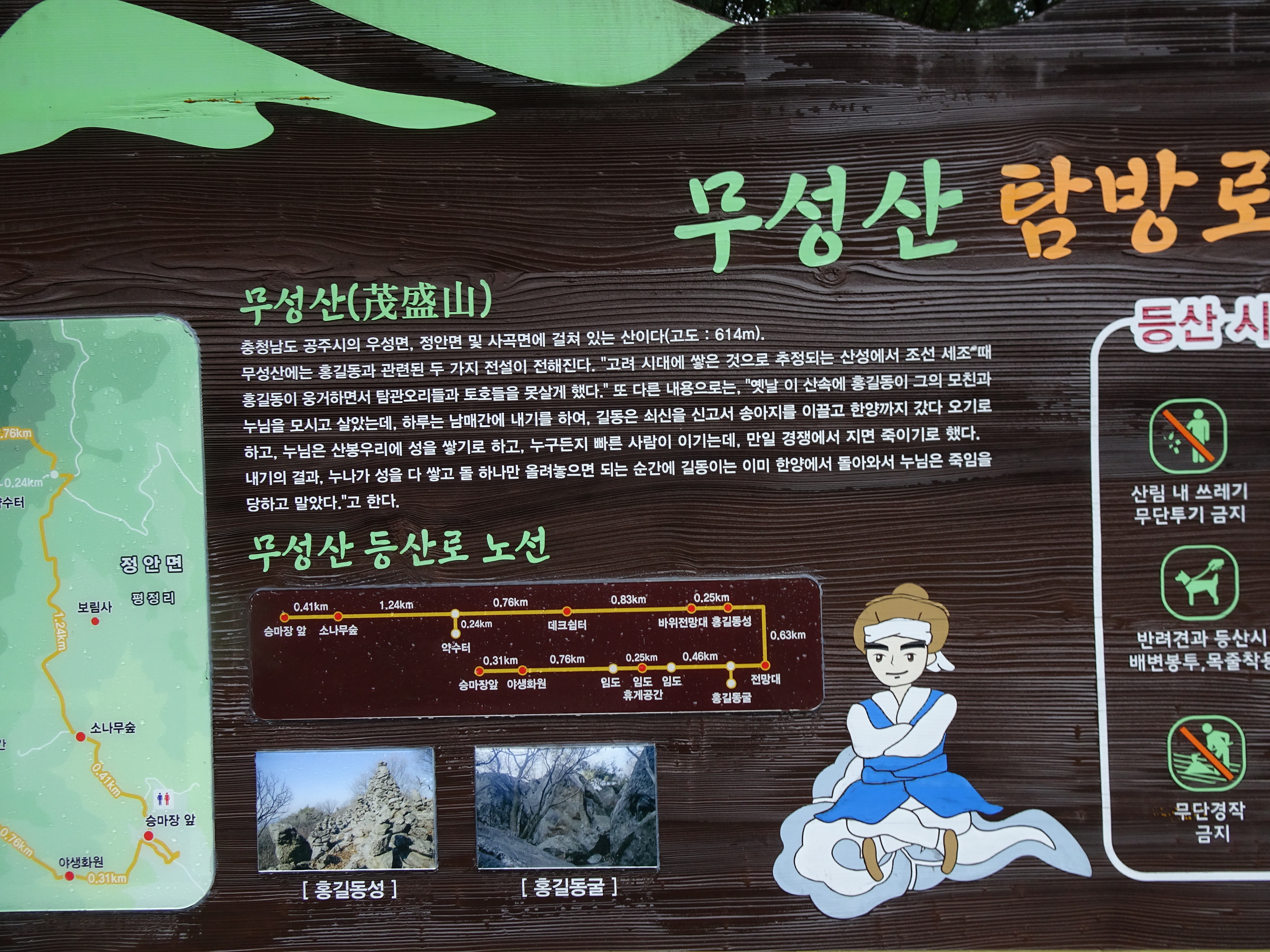 - 공주시 정안면 이시골 - 임도(1.4km) - (순환/한천진입/평정진입)임도삼거리 - 오른쪽 등산로 - 약수터갈림길 - 한천리갈림길 - 데크쉼터 - 포토존갈림길 - 홍길동성 - 무성산 정상/무덤 (되짚어 오기) ※ 총 8.0km (약간의 알바 포함)