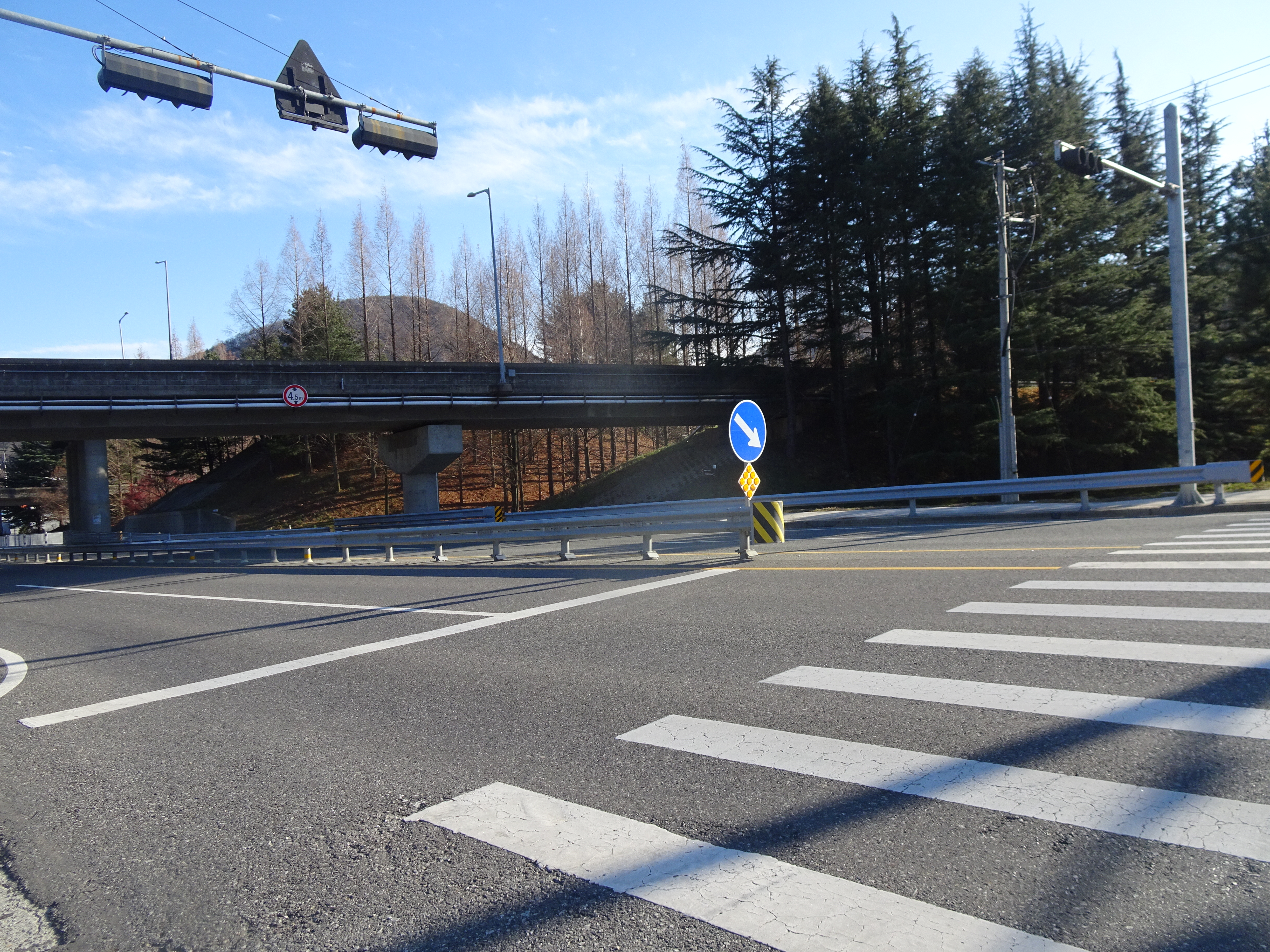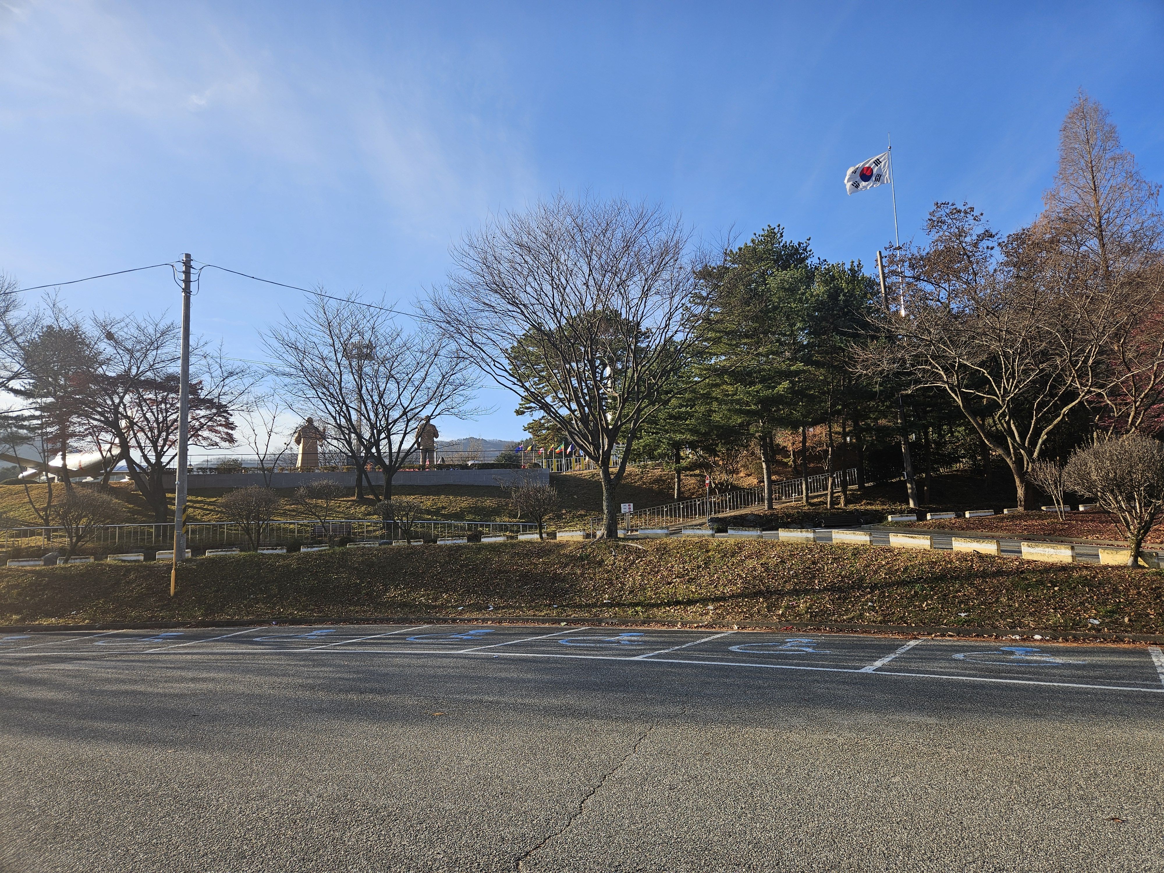 왼쪽 아래 다부동전적기념관 주차장을 바라보며 횡단보도를 건넌다.