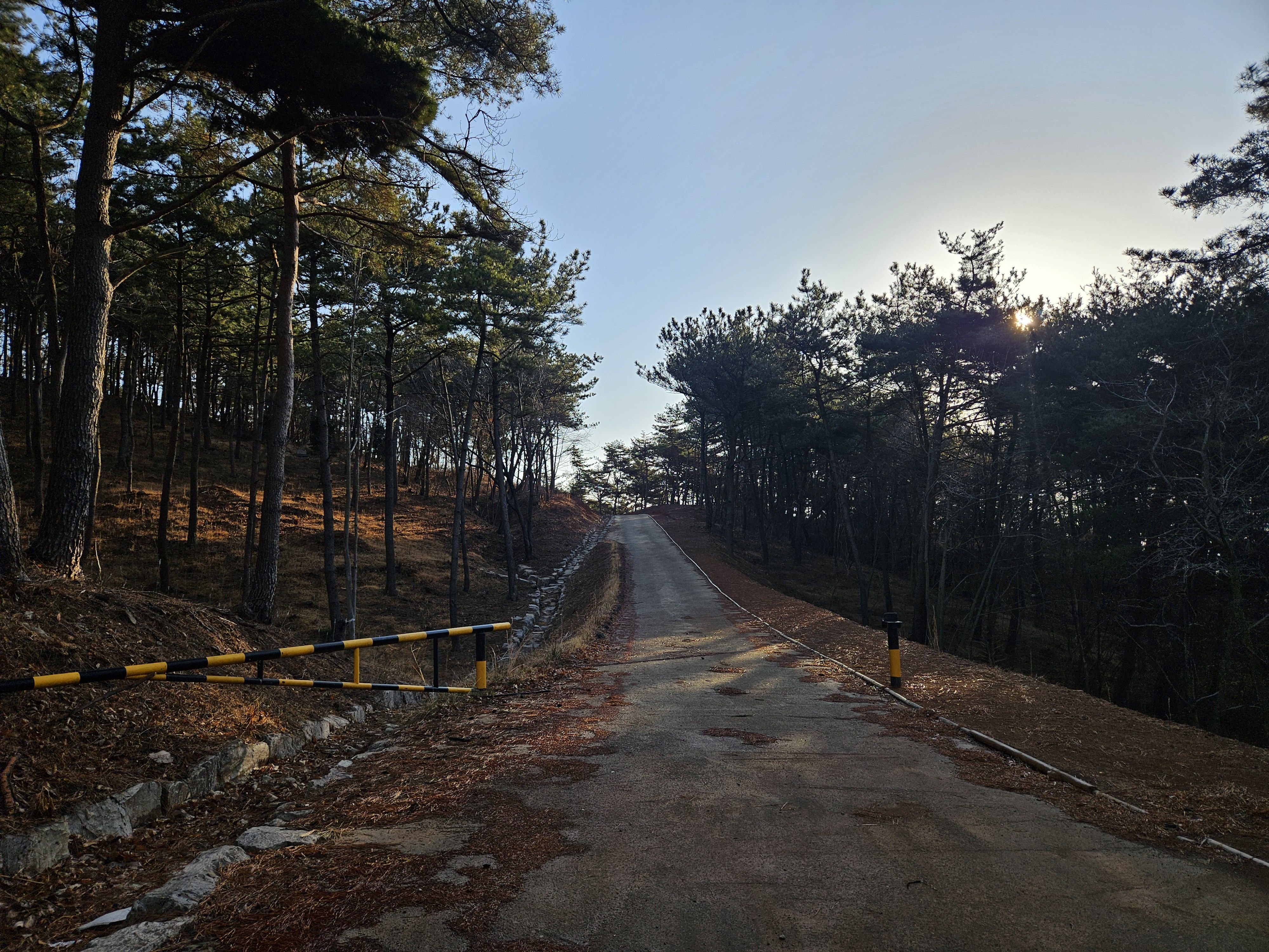 우리는 약간 오른쪽으로 가서 임도 차단기를 지나 갔다.