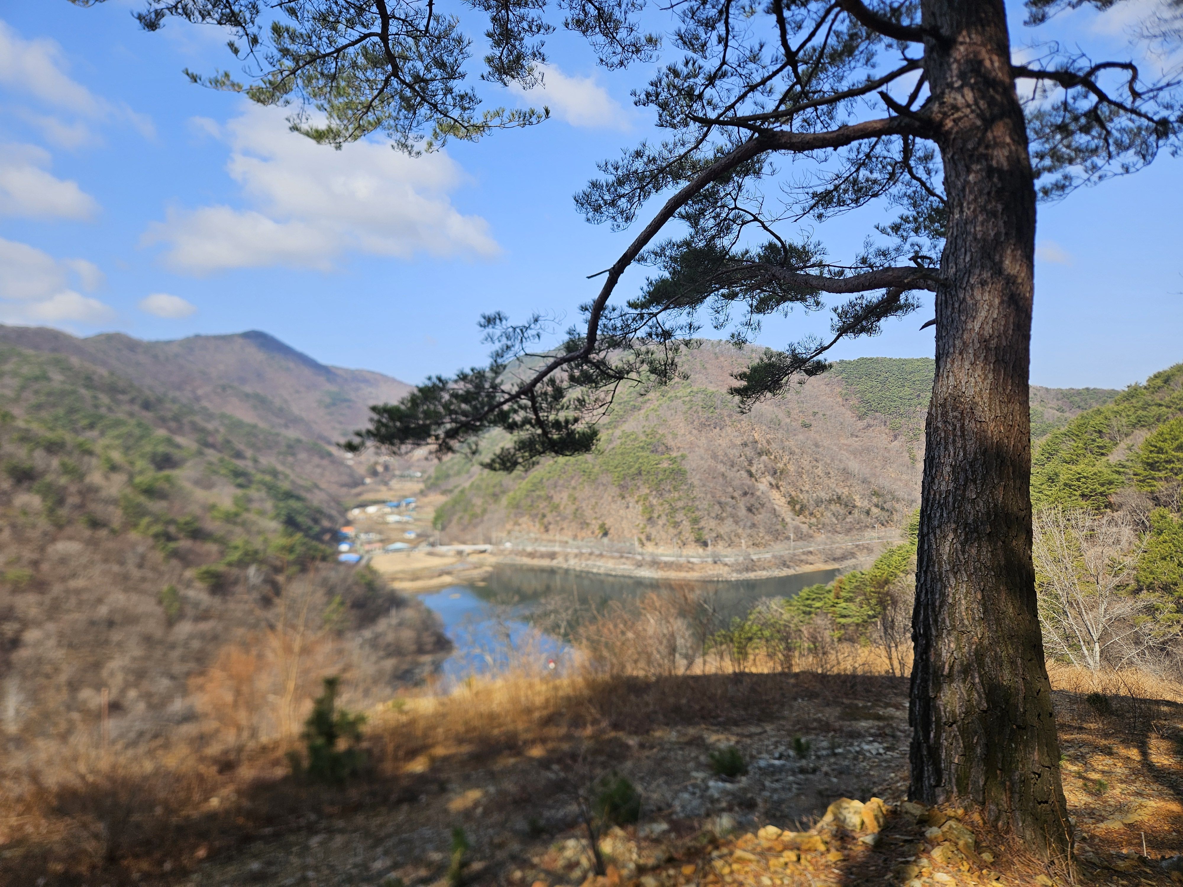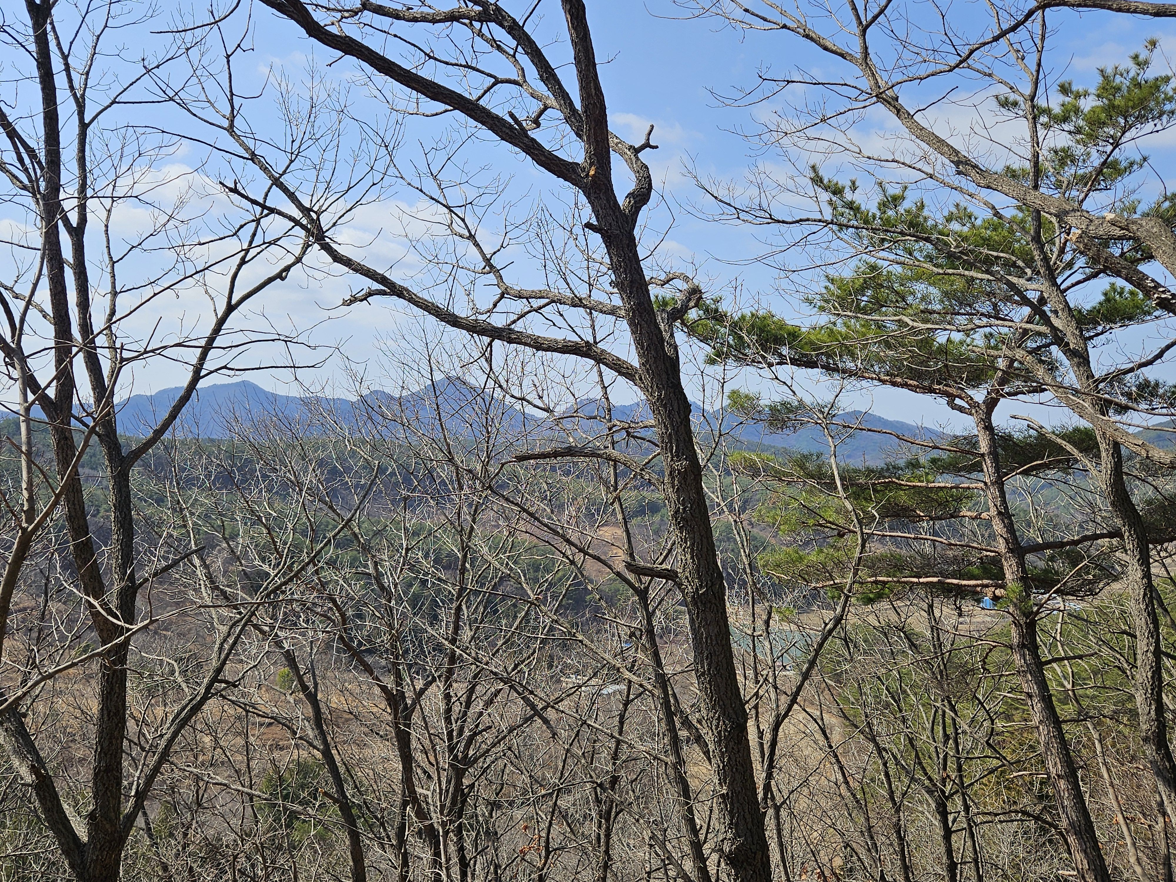 되돌아 보니 나뭇가지들 사이로 성지산이 보인다.